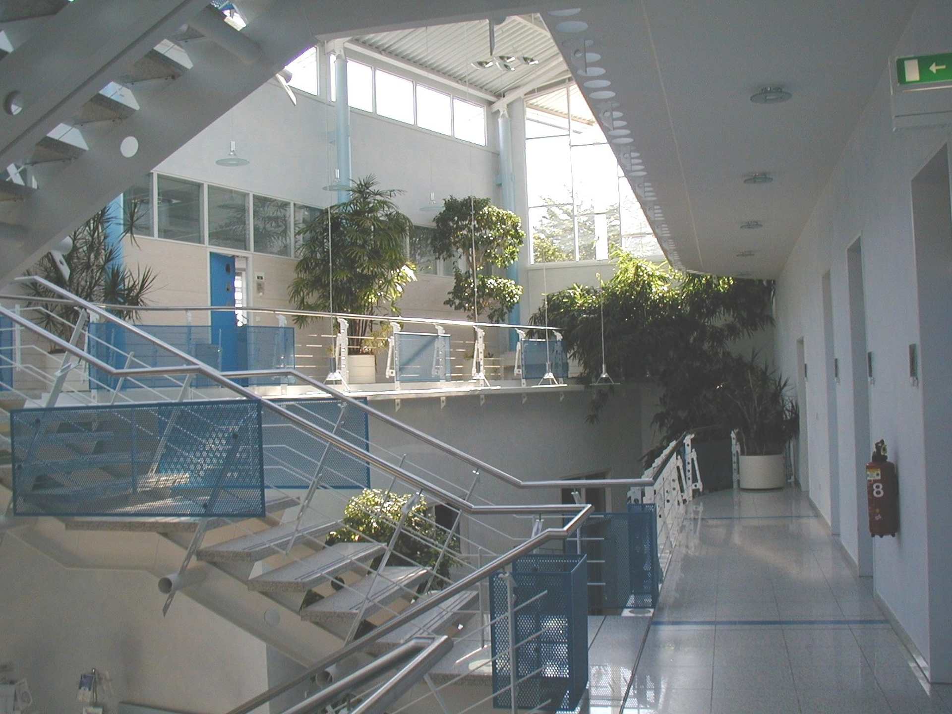 Das Energiekonzept sieht ausserdem eine Lüftungsanlage mit Wärmerückgewinnung und vorgeschalteten Luft- Erdkollektoren vor, die im Winter die Zuluft vorwärmt und im Sommer kühlt. Zusätzlich werden die Fenster nachts automatisch gekippt, was zu einer Nachtauskühlung mit Aktivierung der massiven Speichermassen der Betondecken führt. Durch Präsenzmelder wird der Strom- und Heizenergieverbrauch und die -kosten nochmals zusätzlich reduziert.