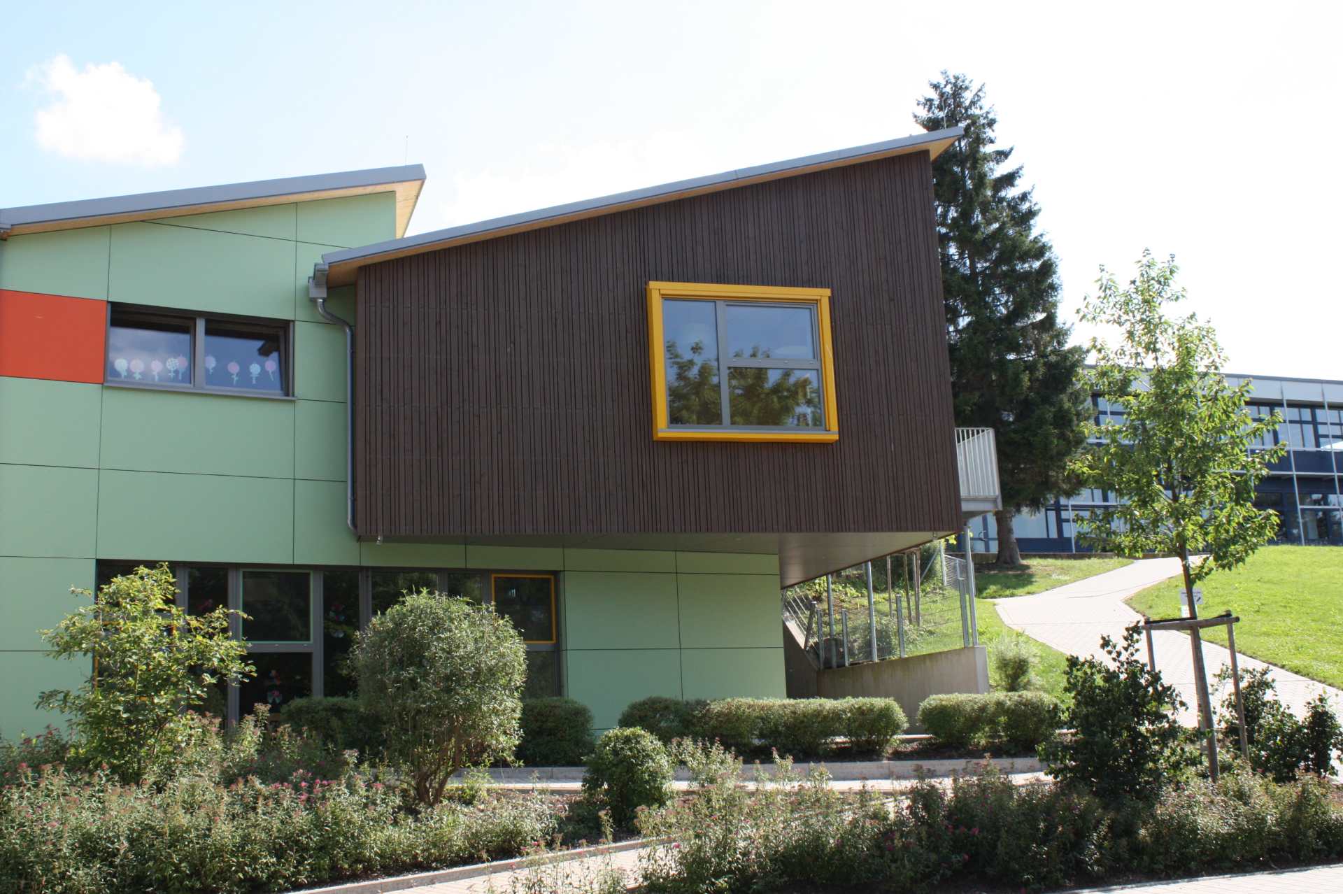 Die notwendige bauliche Erweiterung des Kindergartens von 2 auf 5 Gruppen erfolgte auf der West- Seite des bestehenden Gebäudes in Richtung der Grund- und Hauptschule, durch einen eingeschossigen Pultdach-Baukörper mit teilweiser Unterkellerung. Dieser bildet durch die leichte Drehung gegenüber dem Bestandsgebäude einen zusätzlichen geschützten Außenraum und ermöglicht eine optimale Belichtung der Räume im Bestand und im Anbau.