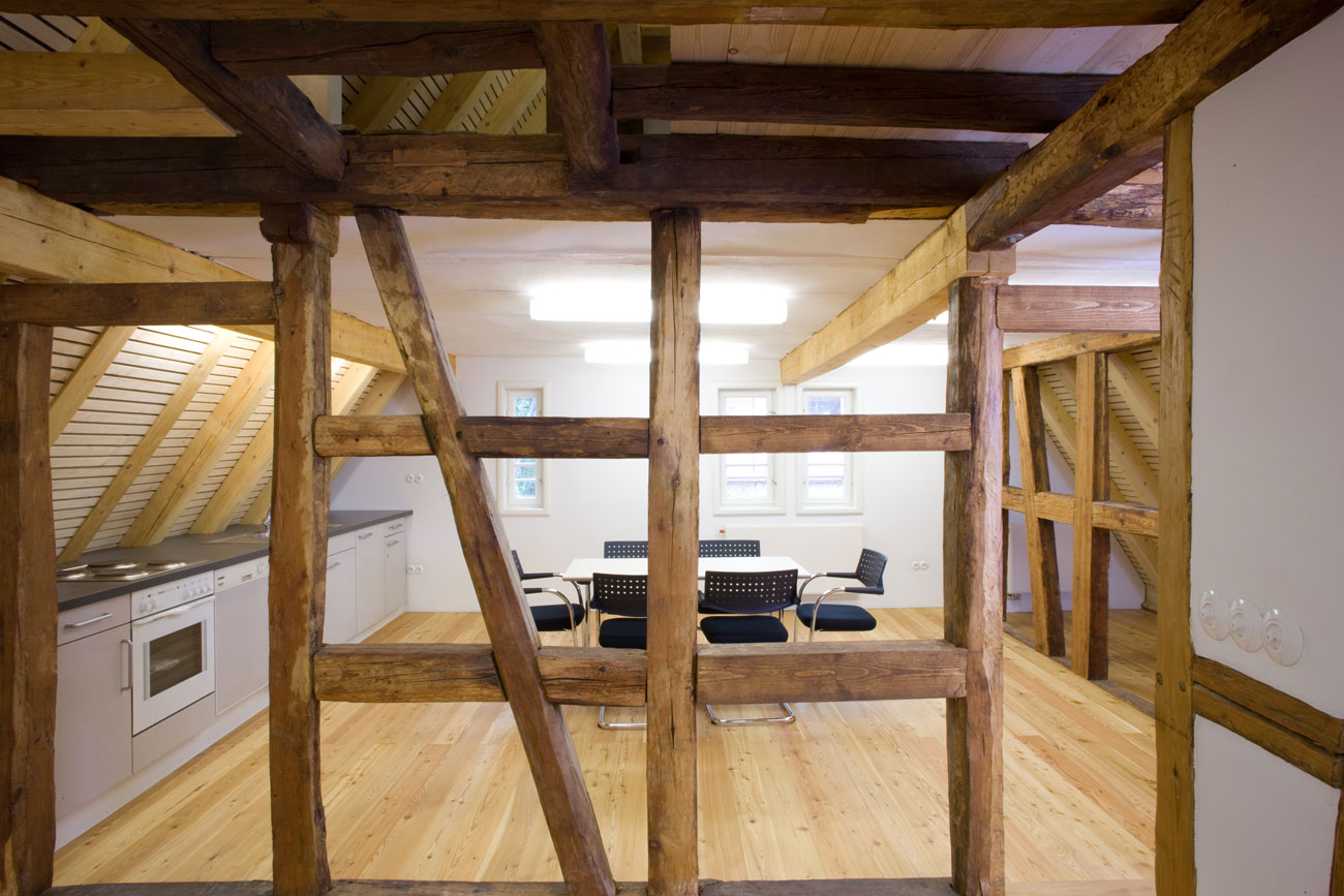 Das bisher ungenutzte Dach des Weinbrennerhauses ist ebenfalls mit Holzwolleplatten gedämmt, zur Erhaltung des sichtbaren, „rohen“ Charakters des Dachstuhls ist die Dachschalung aus sägerauhen, unbehandelten Holzleisten ausgeführt. Bestehende erhaltenswerte Details wurden wiederaufgearbeitet, neue Details zeitgemäß neu interpretiert und hochwertig ausgeführt.